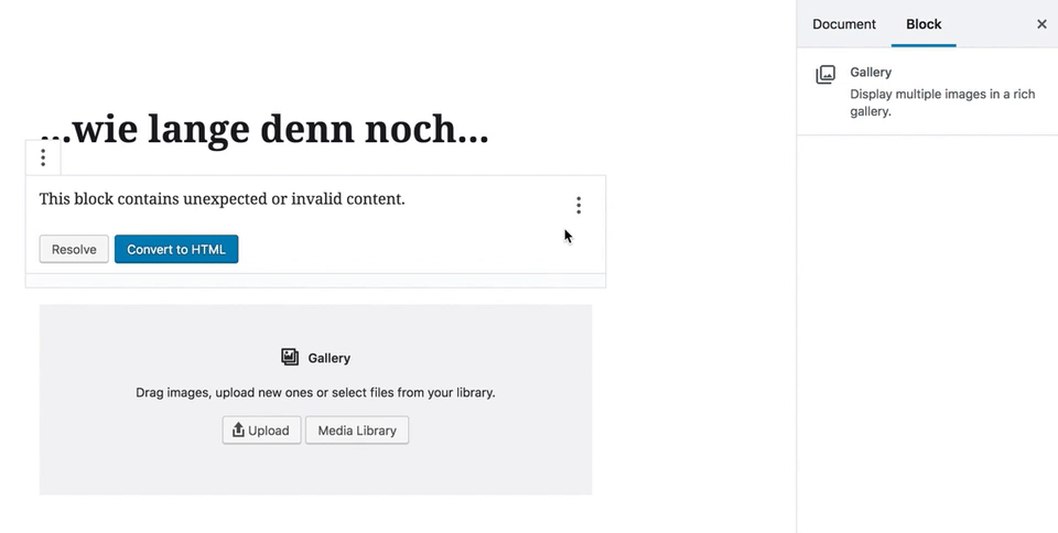 Here's a gif to demonstrate how it looked between views (also notice in the sidebar that the "Advanced" panel is not available for the broken gallery block):