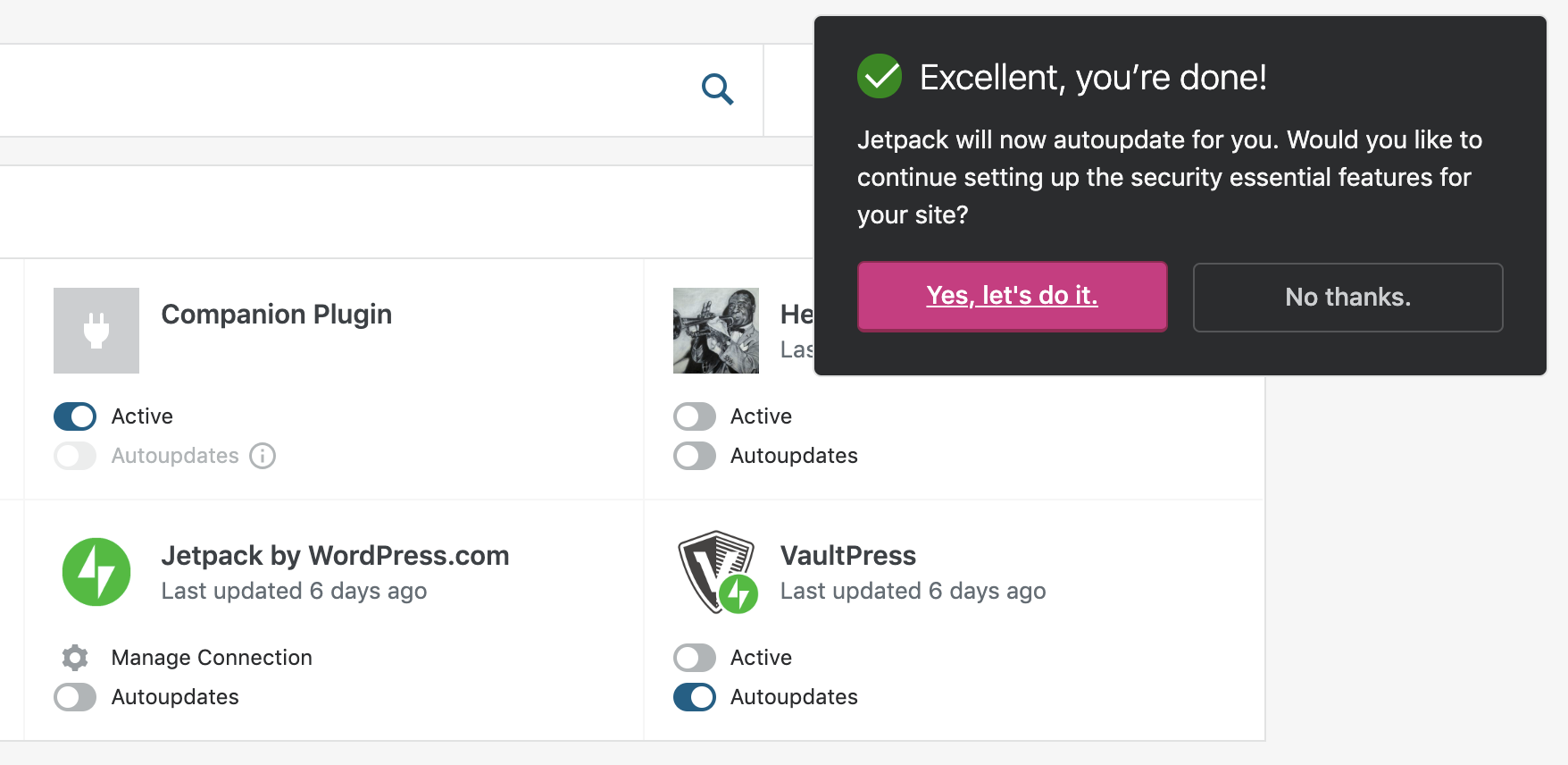 If I change that return value to true, things _almost_ work: I get the first step (asking me to enable autoupdates for the Jetpack plugin) -- but only after scrolling.